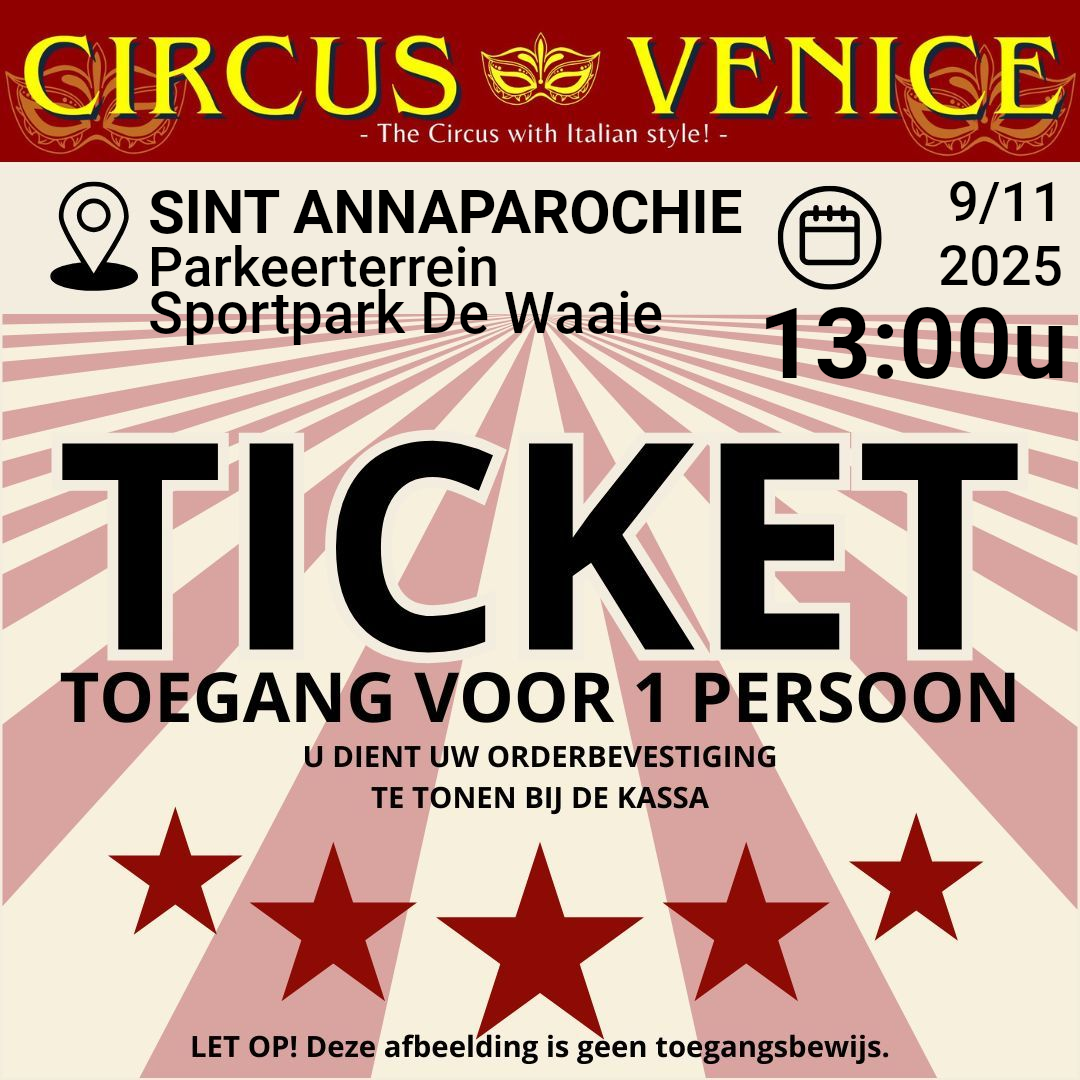ENTREETICKET CIRCUS VENICE. 13:00 uur start de voorstelling. Kom op tijd. De tent gaat 30 minuten voor aanvang open. De eerste twee rijen banken zijn alleen voor de kinderen.