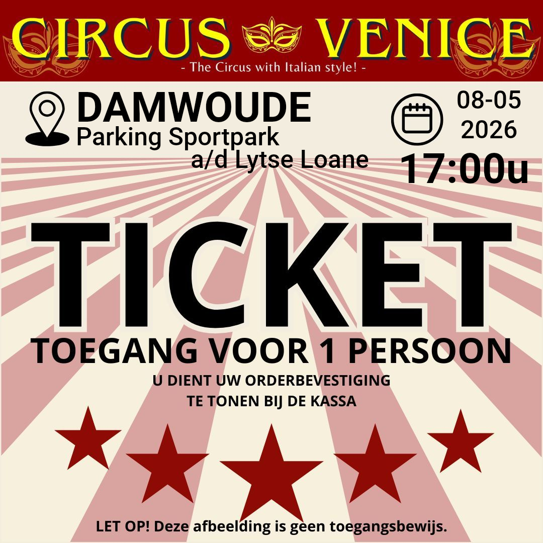 ENTREETICKET CIRCUS VENICE. 17:00 uur start de voorstelling. Kom op tijd. De tent gaat 30 minuten voor aanvang open. De eerste twee rijen banken zijn alleen voor de kinderen.