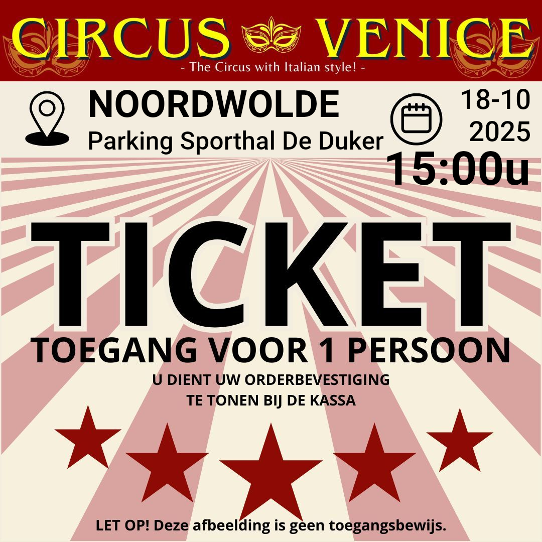 ENTREETICKET CIRCUS VENICE. 15:00 uur start de voorstelling. Kom op tijd. De tent gaat 30 minuten voor aanvang open. De eerste twee rijen banken zijn alleen voor de kinderen.